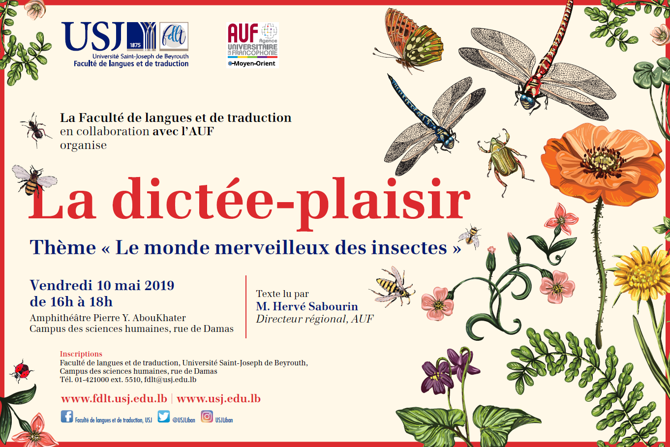 La Faculté de langues et de traduction de l'Université Saint-Joseph (USJ), en collaboration avec l’AUF au Moyen-Orient, organise une dictée-plaisir sur le thème « Le monde merveilleux des insectes » le vendredi 10 mai 2019 de 16h à 18h à l'Amphithéâtre Pierre Y. Abou Khater du Campus des sciences humaines de l'Université Saint-Joseph.