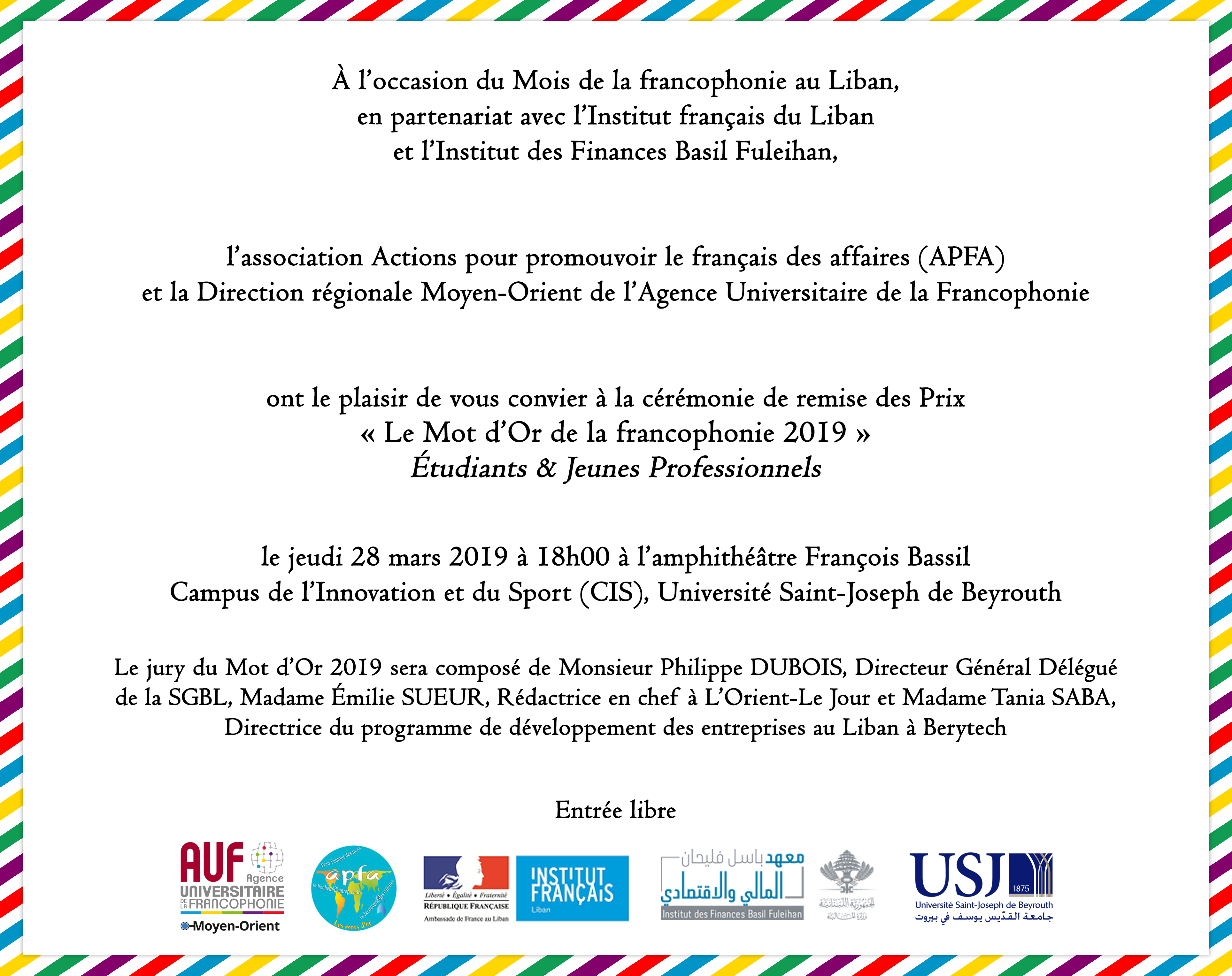 À l’occasion du Mois de la francophonie au Liban, la Direction régionale Moyen-Orient de l’Agence Universitaire de la Francophonie organise en partenariat avec l’association Actions pour promouvoir le français des affaires (APFA), l’Institut français du Liban et l’Institut des Finances Basil Fuleihan, la cérémonie de remise des Prix « Le Mot d’Or de la francophonie 2019 » (Étudiants et Jeunes Professionnels), le jeudi 28 mars 2018 à 18h00, à l’auditorium François Bassil, Campus de l'Innovation et du Sport, Université Saint-Joseph de Beyrouth.