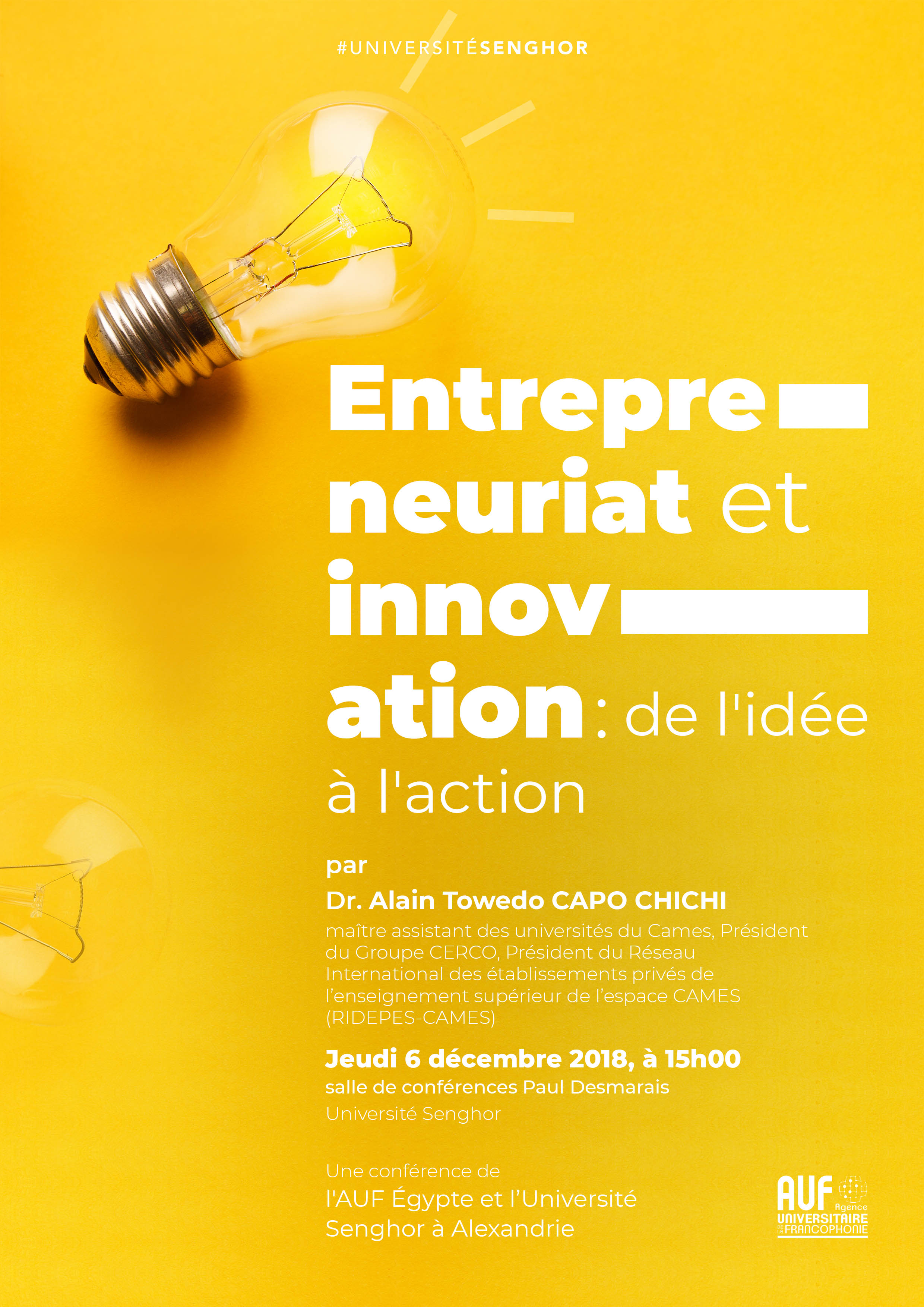 Dans le cadre du projet « Centre pour l’insertion professionnelle, l’innovation et l’entrepreneuriat en Égypte » (CIPIEE), l’AUF, en partenariat avec l'Université Senghor, organise une conférence sur le thème « Entrepreneuriat et innovation: de l'idée à l'action », animée par Dr. Alain Towedo CAPO CHICHI, le jeudi 6 décembre, de 15h00 à 17h00, à l'Université Senghor, salle de conférence, 9ème étage.