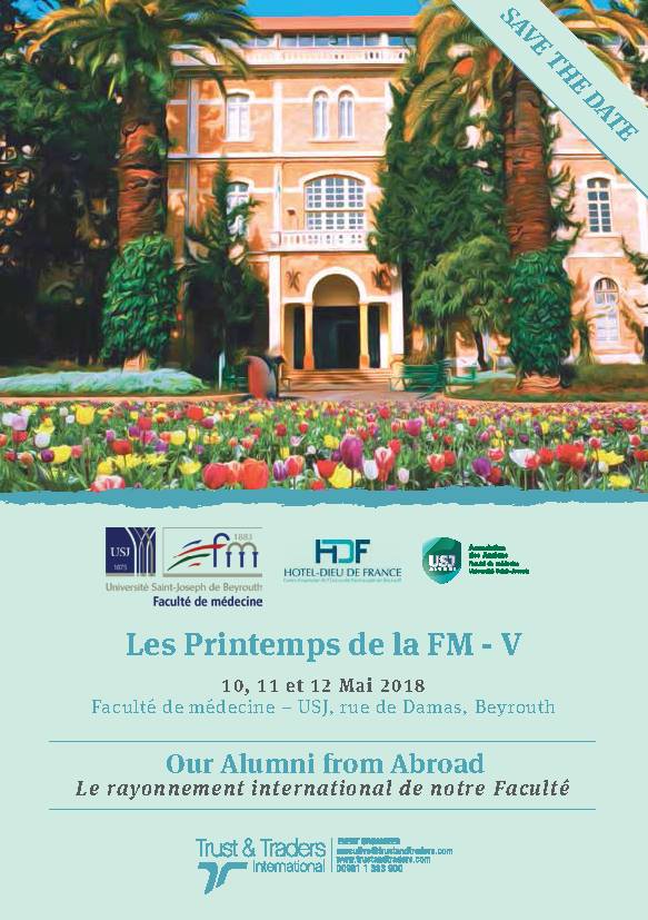 La Faculté de Médecine de l’Université Saint-Joseph (USJ) organise, avec le soutien de l'AUF, la cinquième édition des Printemps de la Faculté du 10 au 12 mai 2018 sur le Campus des sciences médicales de l'USJ (Rue de Damas, Beyrouth). Cette conférence annuelle marque cette année l’ouverture à tous les Anciens de la Faculté répartis à travers le monde.