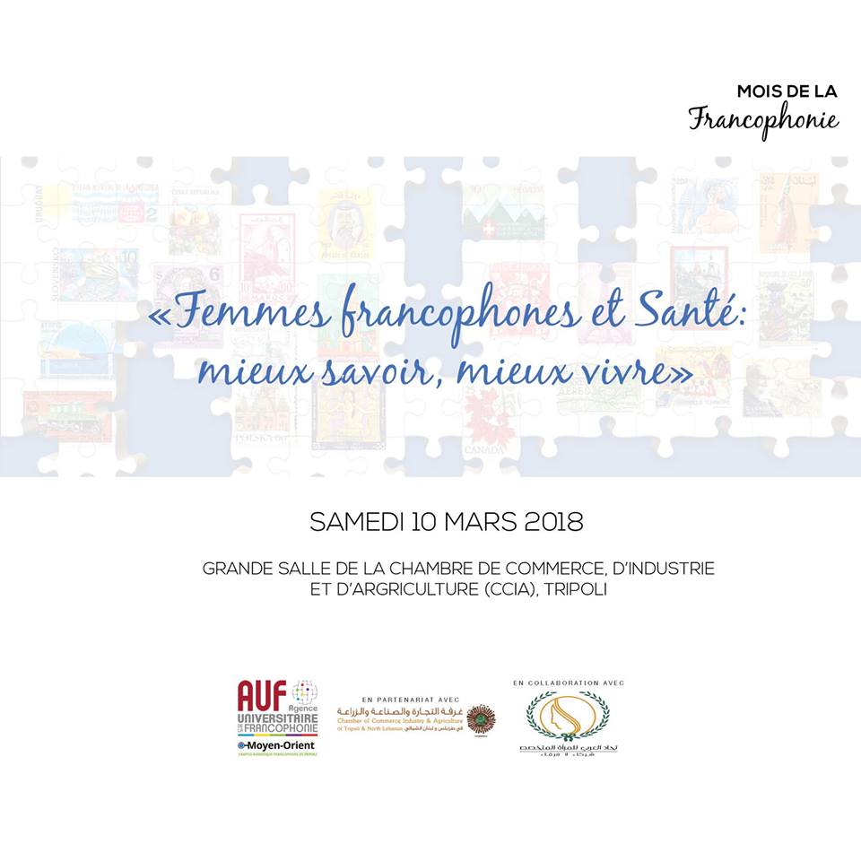 Le Campus numérique francophone de l'AUF Moyen-Orient à Tripoli en partenariat avec la Chambre de Commerce, d’Industrie et d’Agriculture (CCIA) de Tripoli et en collaboration avec l’Union des femmes spécialisées organise une journée intitulée « Femmes francophones et Santé : mieux savoir, mieux vivre », le samedi 10 mars, dans la grande salle de la Chambre de Commerce, d’Industrie et d’Agriculture (CCIA) de Tripoli.