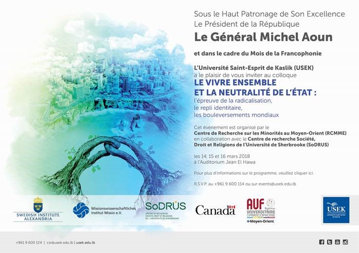Sous le Haut Patronage de Son Excellence le Président de la République, le Général Michel Aoun, et dans le cadre du Mois de la Francophonie, l’Université Saint-Esprit de Kaslik (USEK) organise un colloque intitulé : « Le vivre ensemble et la neutralité de l’État : l’épreuve de la radicalisation, le repli identitaire, les bouleversements mondiaux ». L'AUF est partenaire de cet évènement important animé par le Centre de Recherche sur les Minorités au Moyen-Orient (RCMME), en collaboration avec le Centre de recherche Société, Droit et Religions de l'Université de Sherbrooke (SoDRUS).