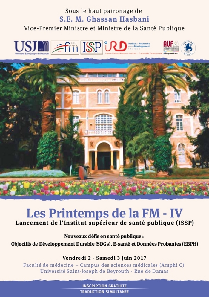 La Faculté de Médecine de l’Université Saint-Joseph (USJ) organise, avec le soutien de l'AUF, le "IVème Printemps de la FM" les 2 et 3 juin 2017 sur le Campus des sciences médicales de l'USJ (Rue de Damas, Beyrouth). Cette conférence annuelle marque cette année le lancement de l’Institut supérieur de santé publique (ISSP).