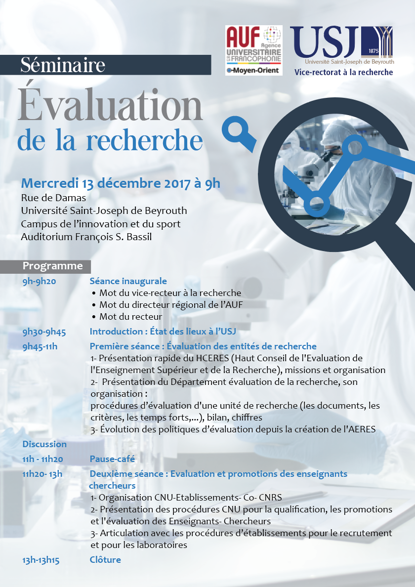Le Vice-rectorat à la recherche de l'Université Saint-Joseph de Beyrouth organise, en partenariat avec l'AUF au Moyen-Orient, un séminaire sur l'évaluation de la recherche le mercredi 13 décembre 2017 sur son Campus de l'innovation et du sport à Beyrouth.
