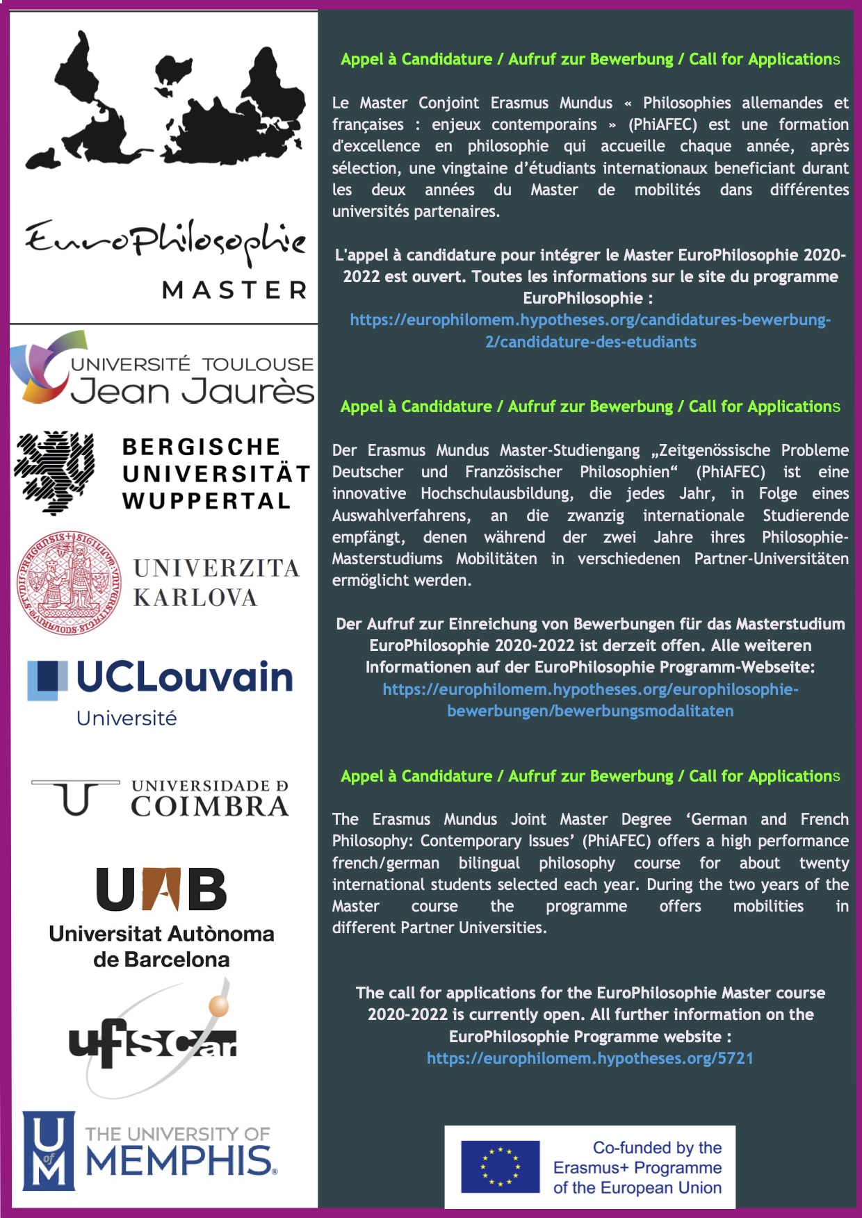 Le Master Conjoint Erasmus Mundus « Philosophies allemandes et françaises : enjeux contemporains » (PhiAFEC) est une formation d'excellence en philosophie qui accueille chaque année, après sélection, une vingtaine d’étudiants internationaux bénéficiant durant les deux années du Master de mobilités dans différentes universités partenaires.